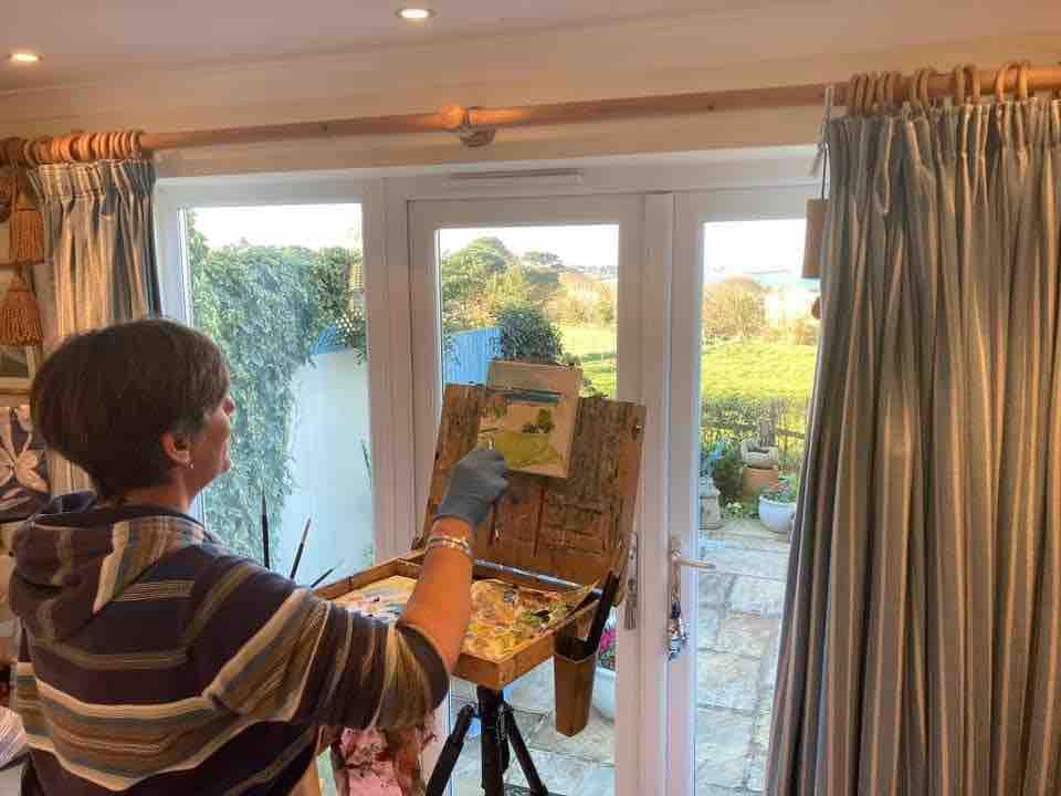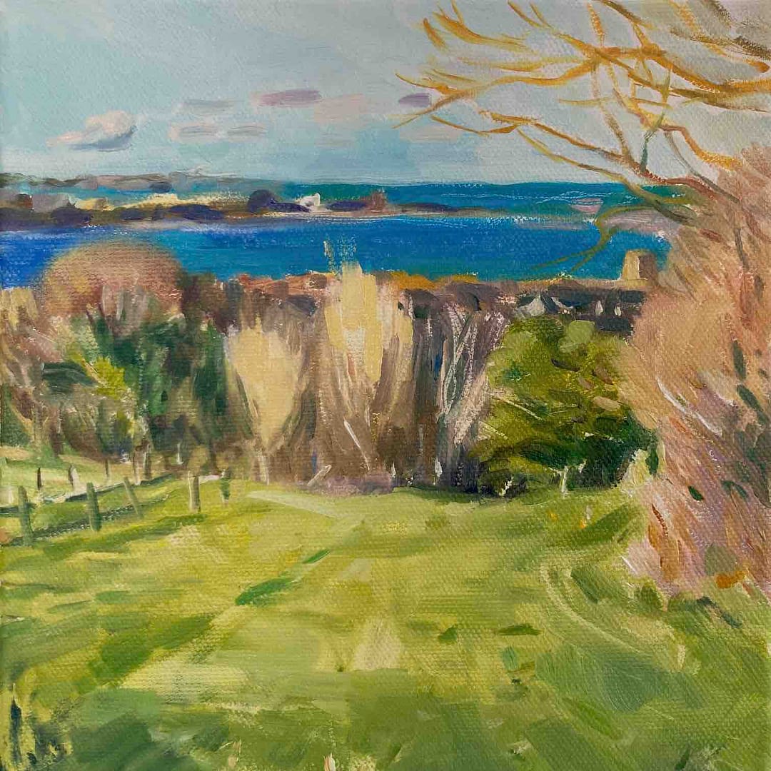 It’s been such a bright day today with wonderfully zingy colours. Still very cold however so the chance to paint a view like this from my friend’s home was too good to pass up. The view west down over gently sloping green fields to the coast of Vazon Bay. The sea was SO blue.