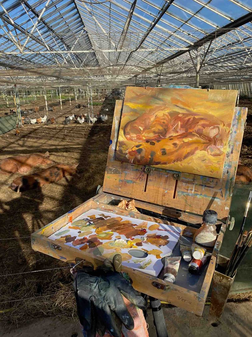 These pigs (Duroc/Oxford sandy & black crosses) made the most well behaved models this morning! The sun shone on them through the greenhouse glass as they lay snout to snout, just basking in the hay. As with most of my subjects for this challenge, it was lovely to paint a subject which I’ve not tackled in a while.