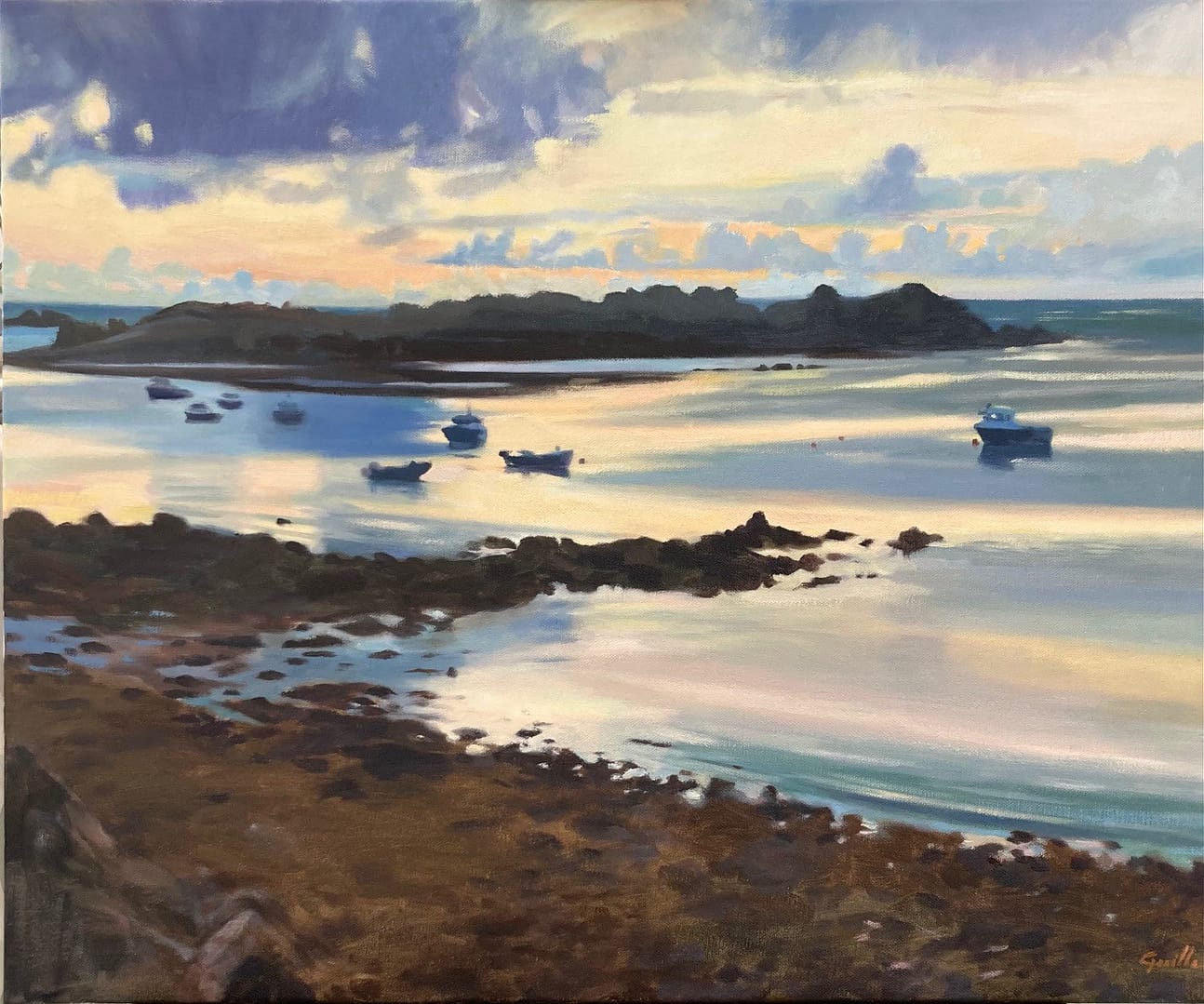 I love the wait.  Sometimes in the dark, for the gradual lightening of the sky and sea, and I love trying to capture this in my work.  One of the most unforgettable sunrises was this one from Petils Bay near Bordeaux Harbour.