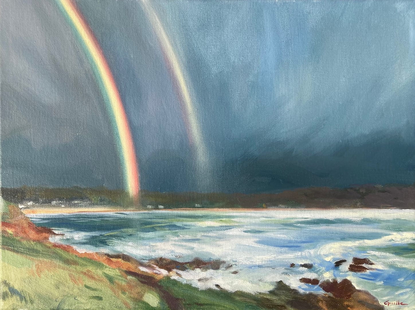 This painting was inspired by a windy walk one evening up on Fort Hommet headland.