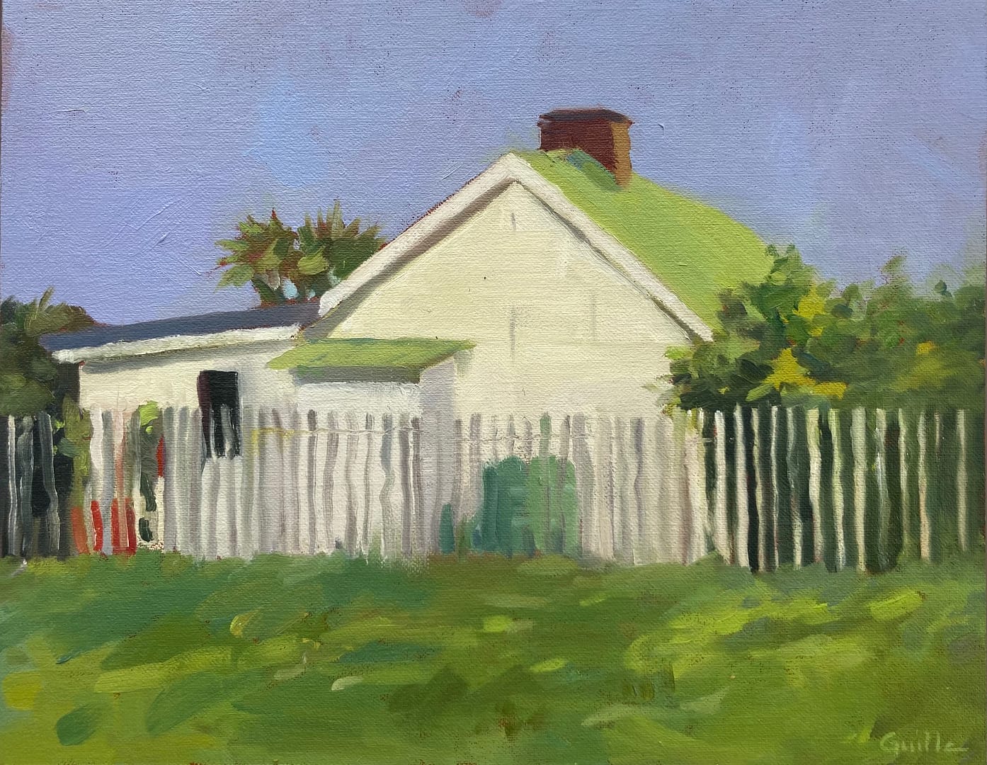 I have always been inspired to paint these tin roofed Sark buildings over the years as so many of them have been pulled down. I love their corrugated iron and bright colours. This one is situated on the East side of the island, just past the Mermaid Tavern.