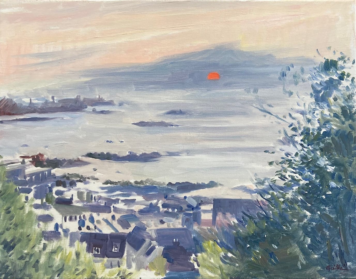 From my joint exhibition entitled ‘Shore, Lines and Brush Marks’, this quite unconventional coastal view was a bit more challenging than my more familiar rocky subjects. Painted as the sun rose, in one sitting, en plein air (outdoors), with direct brush marks and limited palette.
